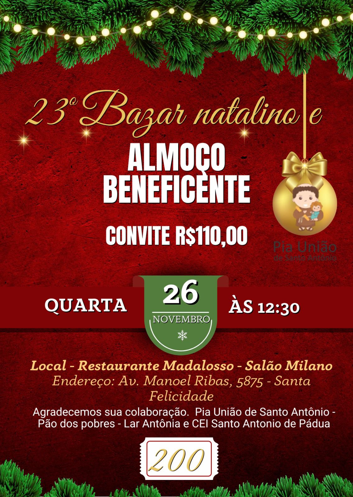 Esperamos você no nosso 23º Bazar Natalino e Almoço Beneficente, no Restaurante Madalosso — Salão Milano.Além de um almoço delicioso, teremos o bazar com produtos